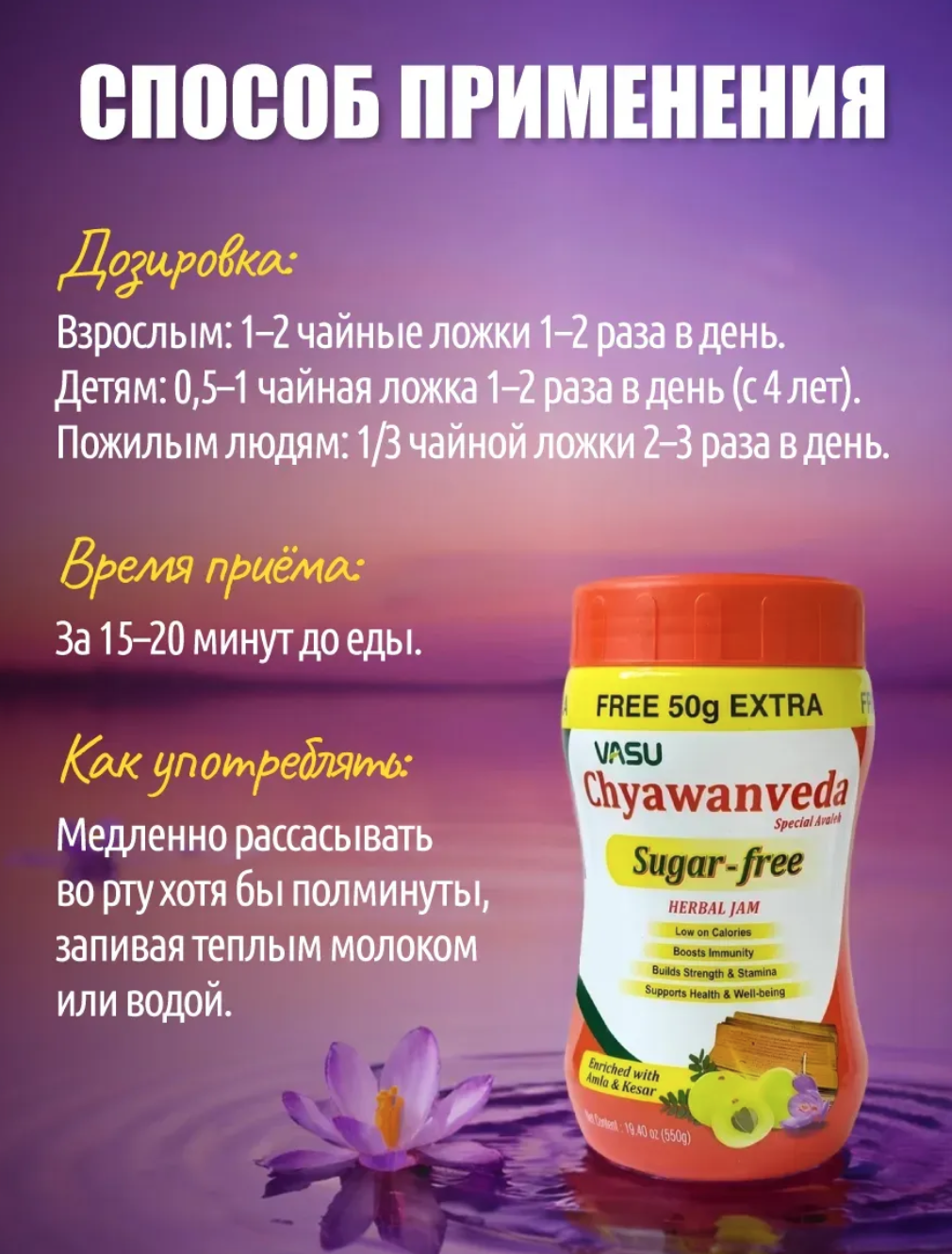 Джем чаванпраш без сахара – уникальное средство, предназначенное специально для тех, кто болен диабетом. Оно, как и традиционная чаванпраш, действует сразу в нескольких направлениях, оказывая при этом мощное омолаживающее действие.