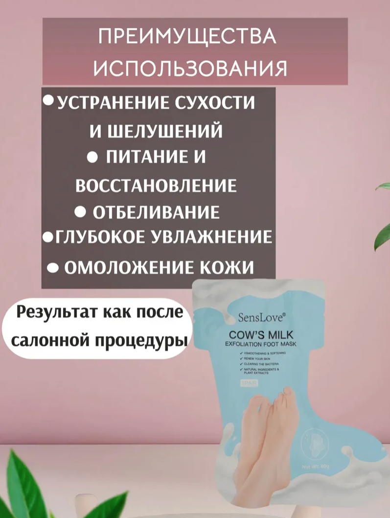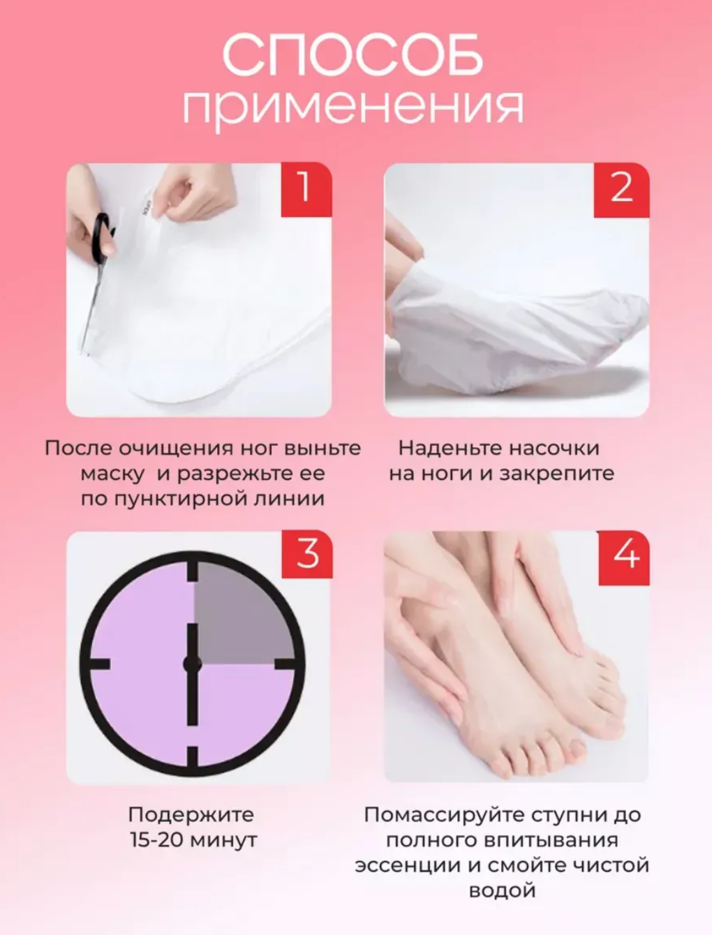 Просто наденьте педикюрную маску-носочки на 15–30 минут — и результат будет заметен уже после первого применения!